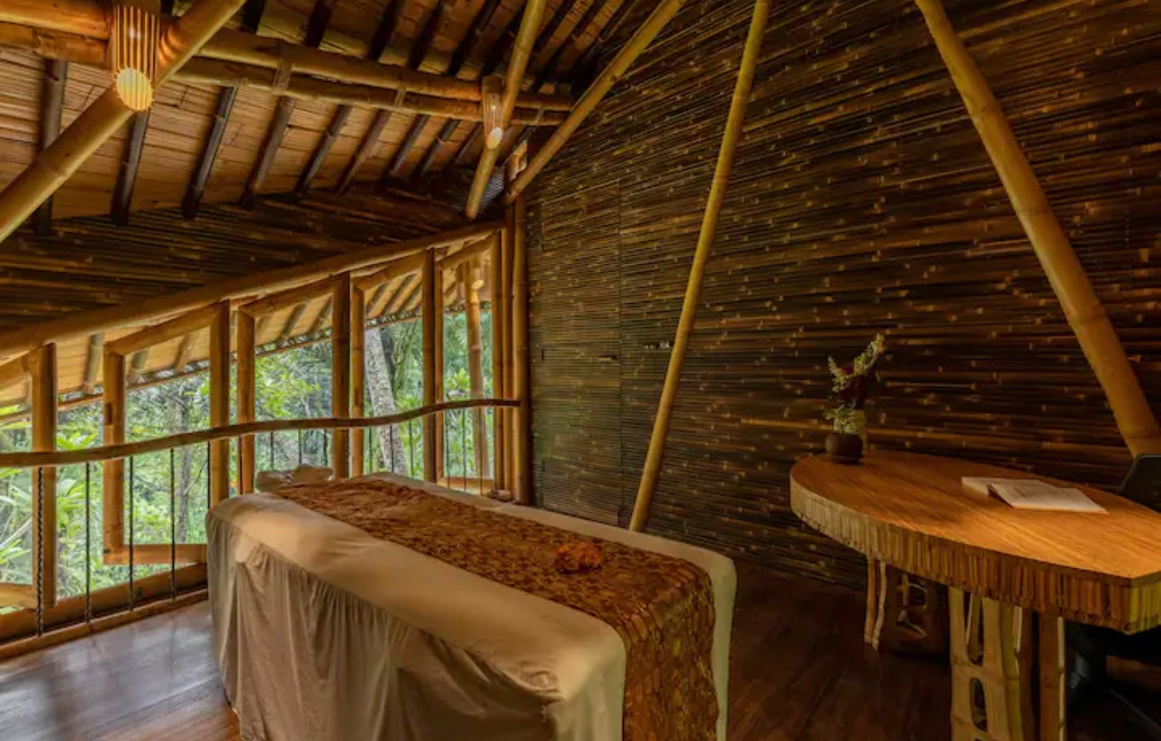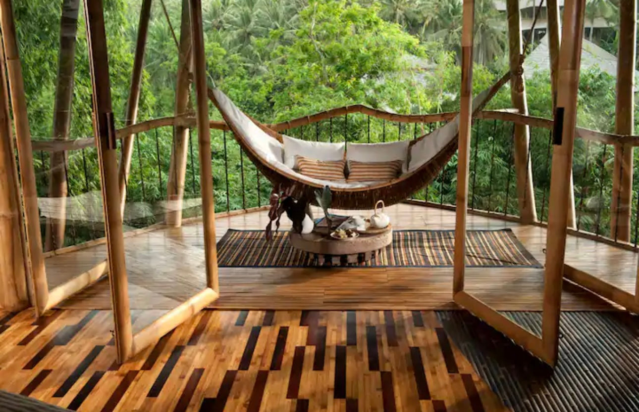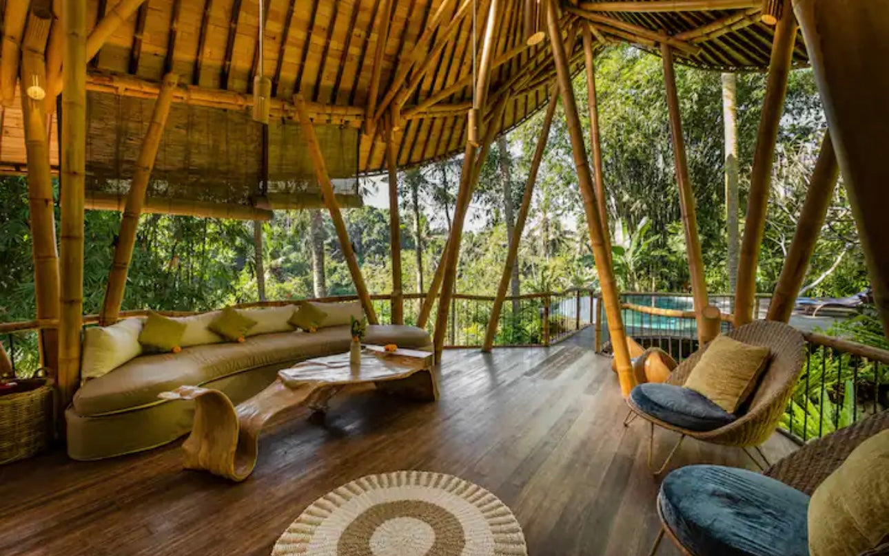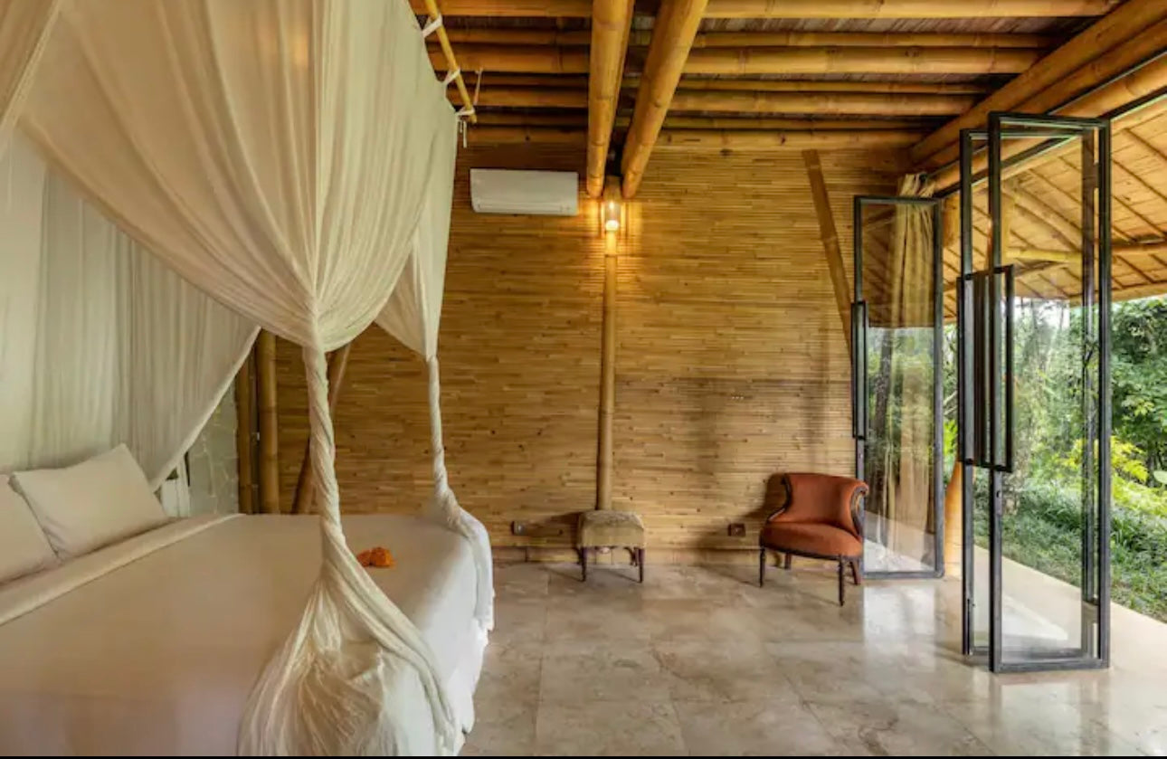 You’ll stay at the stunning Green Village Bali, nestled in the lush jungle along the Ayung River. This eco-friendly community features luxurious bamboo villas, designed to harmonize with the surrounding environment. Each villa offers modern comforts while celebrating sustainable living. Wake up to the sounds of nature and unwind in a serene, eco-conscious setting.